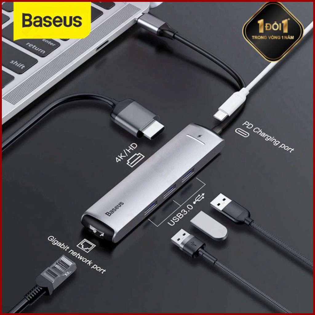 Hub chuyển Type-C Baseus 6 in 1 Smart Hub cho Smartphone/ Laptop/ Macbook (3xUSB 3.0, HDMI 4K, LAN, PD)