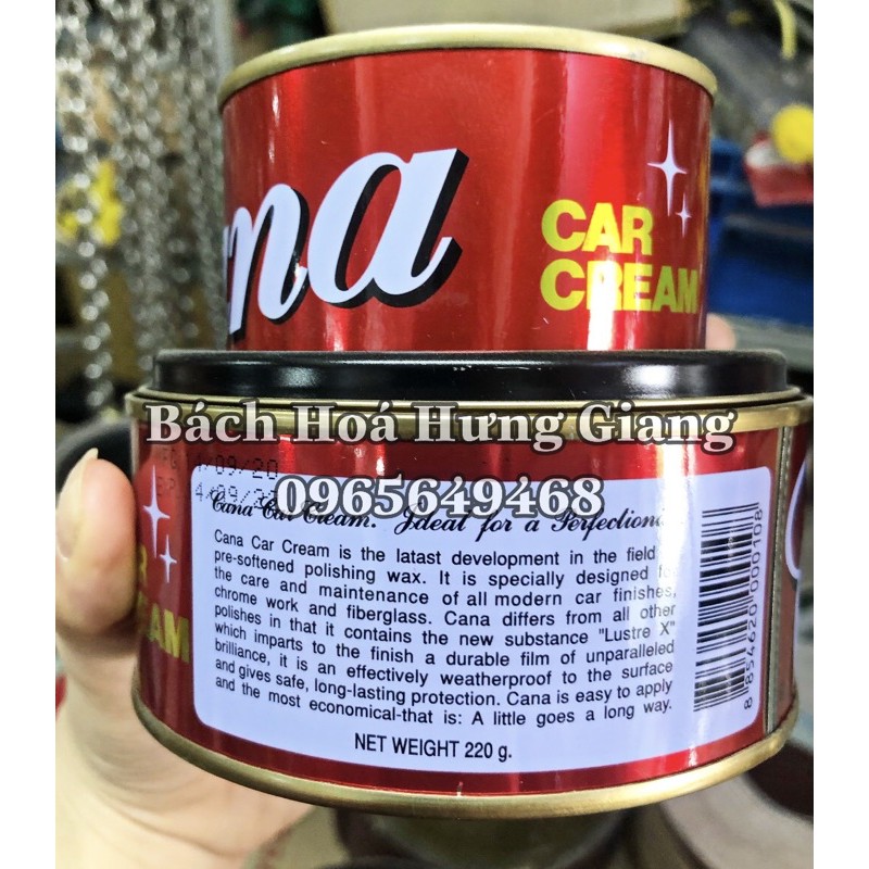 - CANA Car Cream là một lọai sáp dùng để đánh bóng bề mặt các sản phẩm thông dụng như phương tiện cơ giới, kim lọai, đồ gỗ, mặt đá…Cana được phát minh riêng cho việc chăm sóc và bảo vệ các bề mặt mạ Chrome hoặc sợi tổng hợp, giúp giữ độ bền của lớp mạ trước tác động của thời tiết.