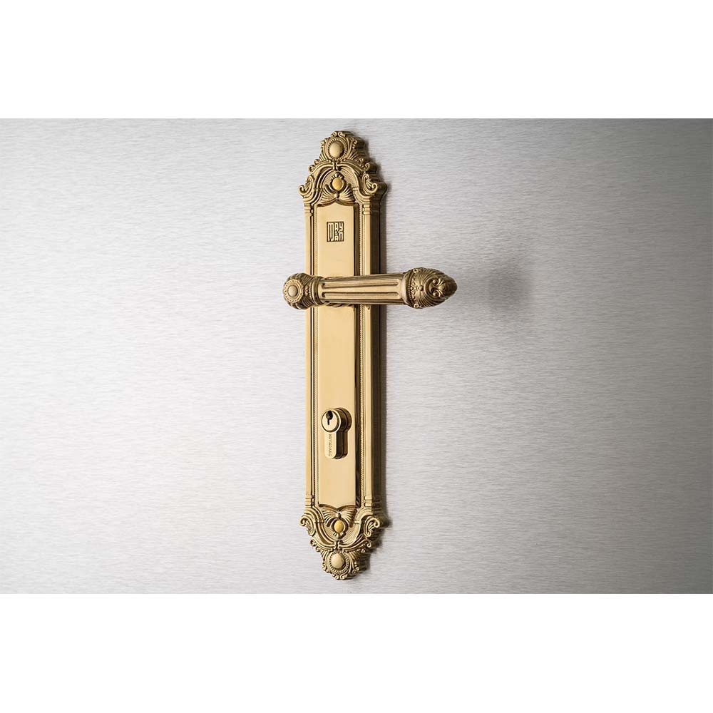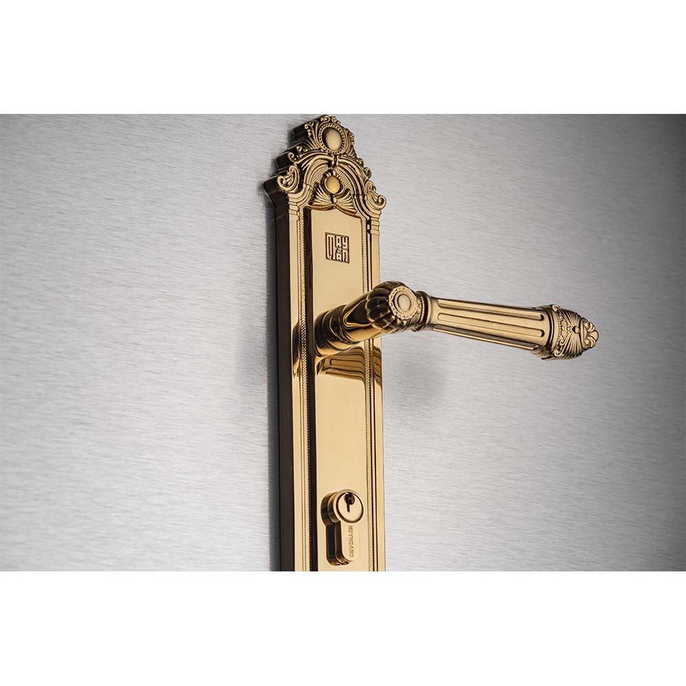 Thuộc dòng sản phẩm khóa tay nắm cao cấp của Huy Hoàng.Tay ốp khóa sản xuất bằng vật liệu đồng vàng (đồng thau) mạ PVD màu vàng gold