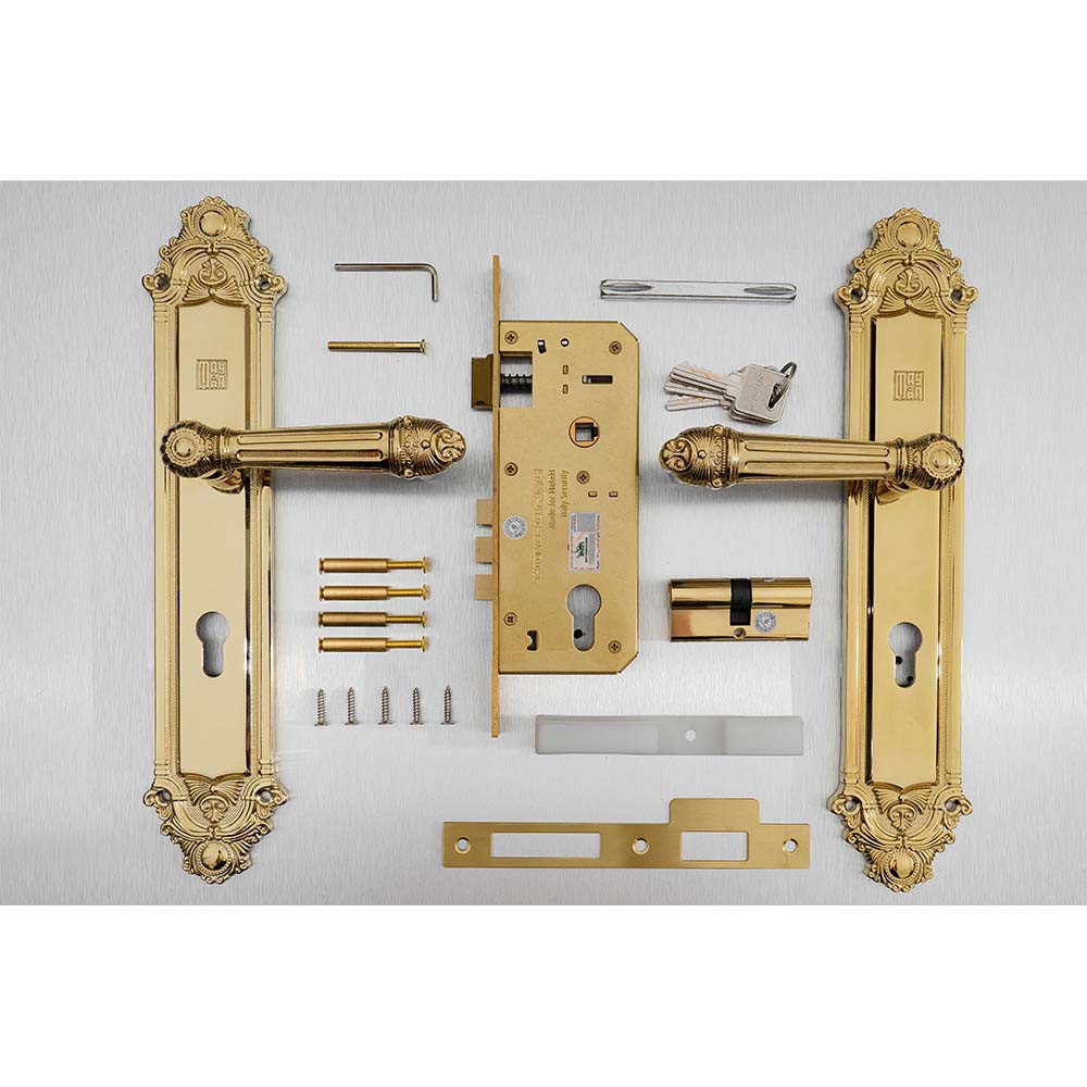 Thuộc dòng sản phẩm khóa tay nắm cao cấp của Huy Hoàng.Tay ốp khóa sản xuất bằng vật liệu đồng vàng (đồng thau) mạ PVD màu vàng gold