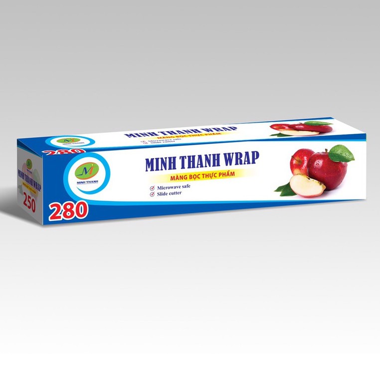 Màng bọc thực phẩm MINHTHANH được đặt trong hộp giấy thiết kế nhỏ gọn, đẹp mắt. Màng bọc MINHTHANH sử dụng hộp giấy có dao nhựa cắt trượt. Người dùng kéo màng bọc ra khỏi hộp, dùng thanh trượt di chuyển từ đầu này đến đầu kia, màng bọc sẽ được cắt thẳng, sạch sẽ.