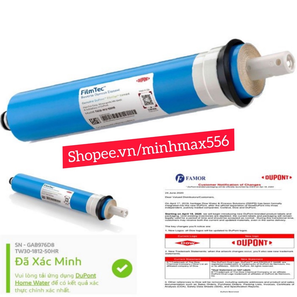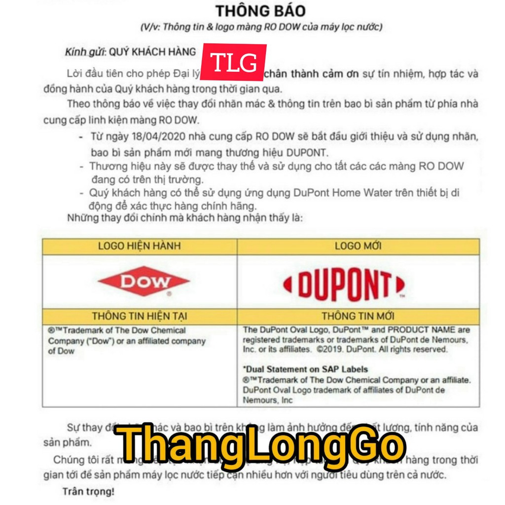 👉 Từ tháng 4/2020 Hãng Dow đã quyết định thay đổi tên sản phẩm màng RO từ DOW FILMTEC thành DuPont FilmTec. Màng vẫn được nhập khẩu chính hãng từ Mỹ, trên tem có mã QR để xác thực hàng chính hãng. Sự thay đổi này không hề làm ảnh hưởng đến chất lượng sản phẩm.