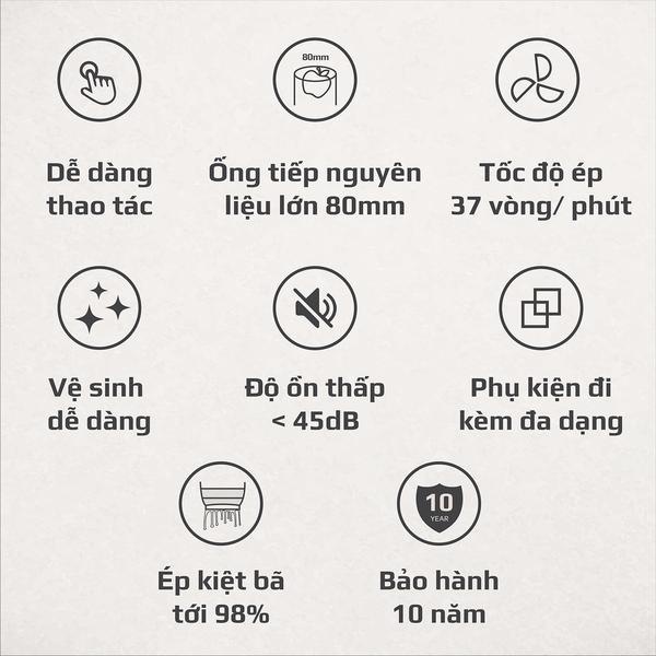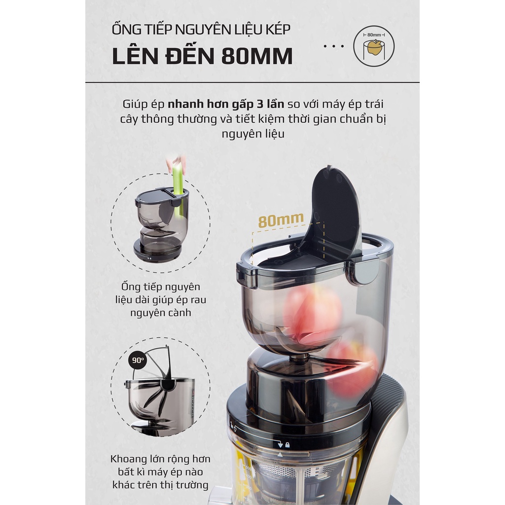 • Ống tiếp nguyên liệu lơn 80mm, giúp ép nhanh gấp 3 lần
