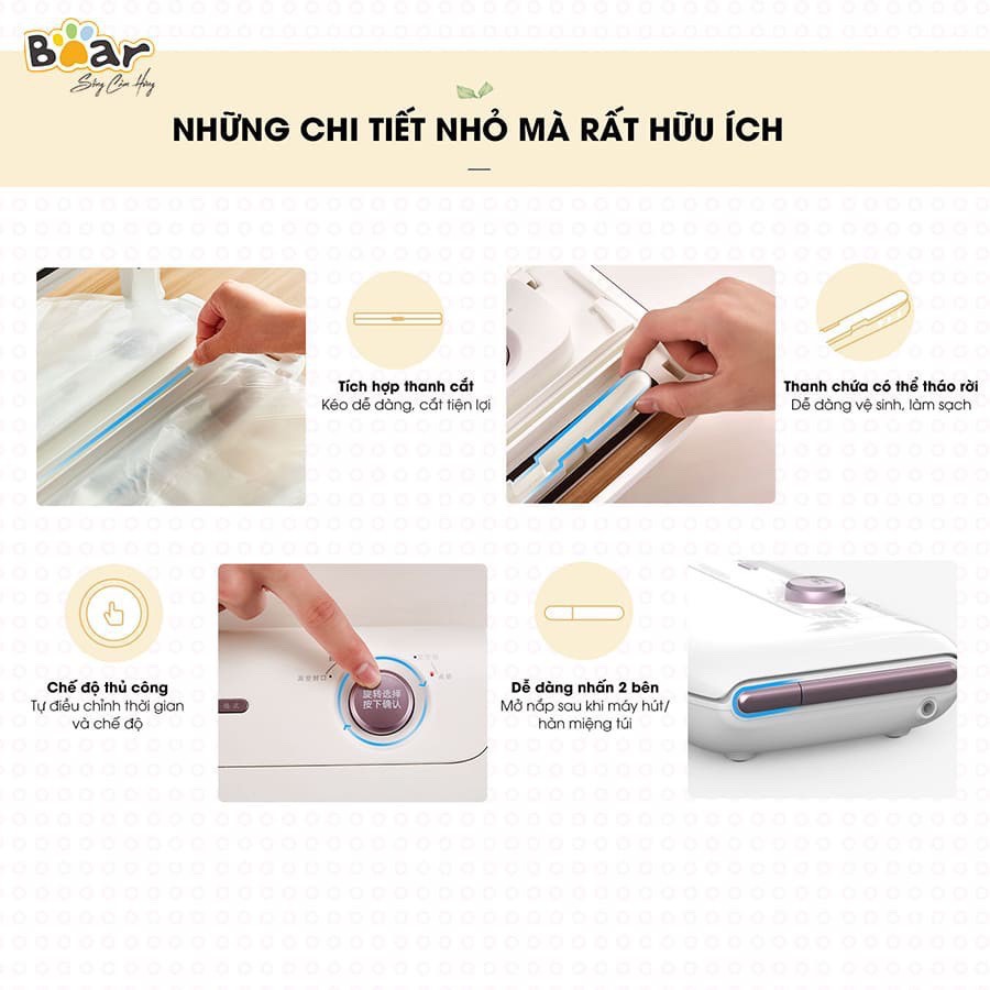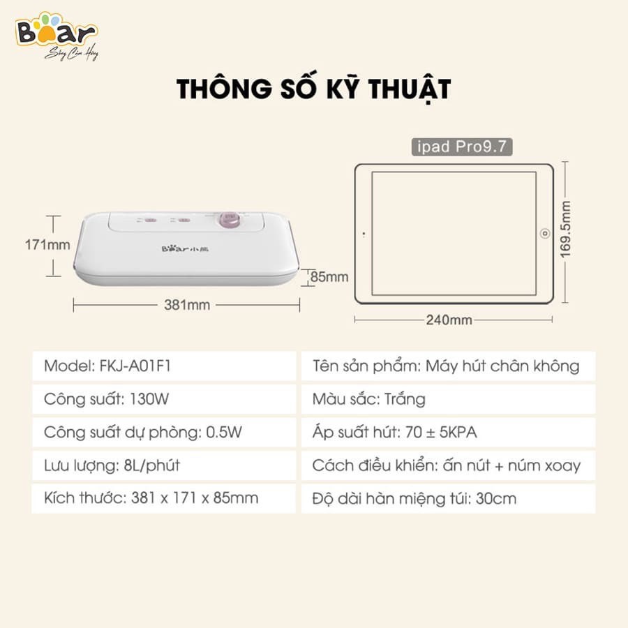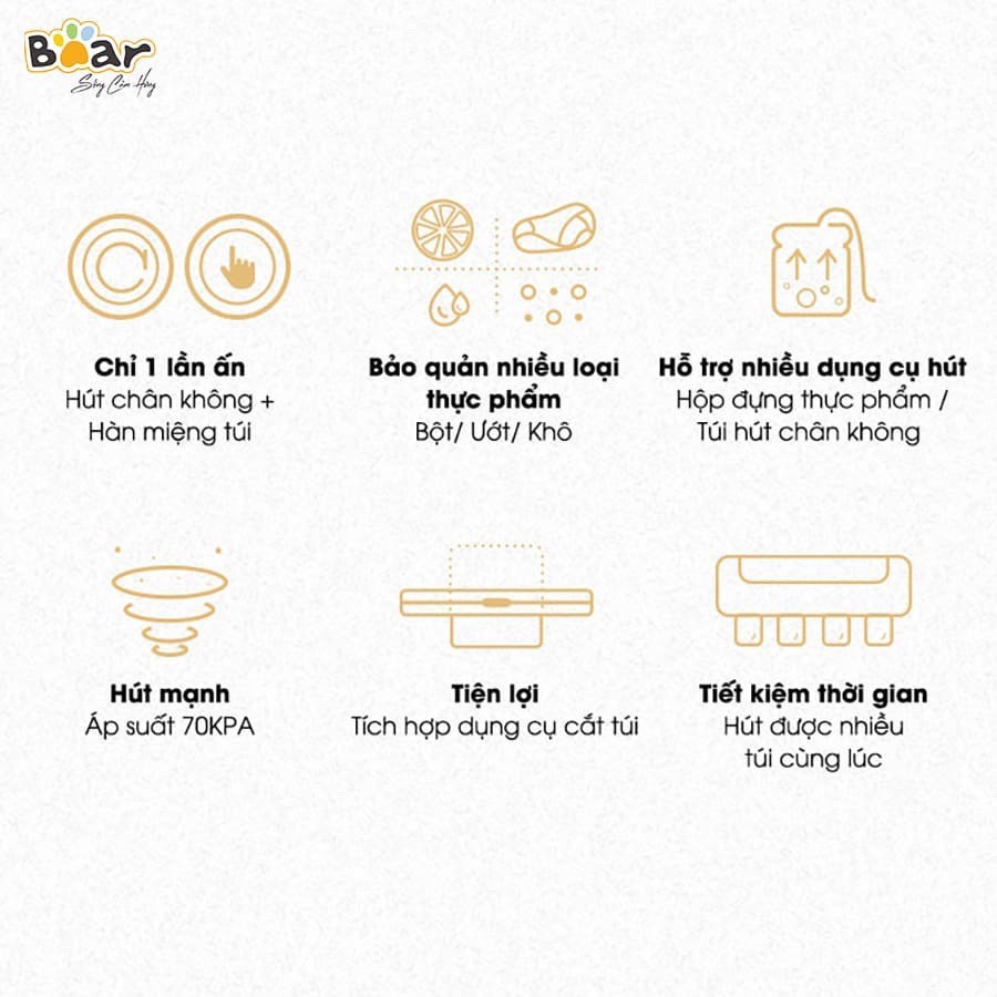 - Máy Hút Chân Không Bear FKJ-A01F1 với thiết kế nhỏ gọn, điều khiển cảm ứng thông minh tích hợp công nghệ hút chân không nhanh chóng chỉ trong vòng 30 giây.