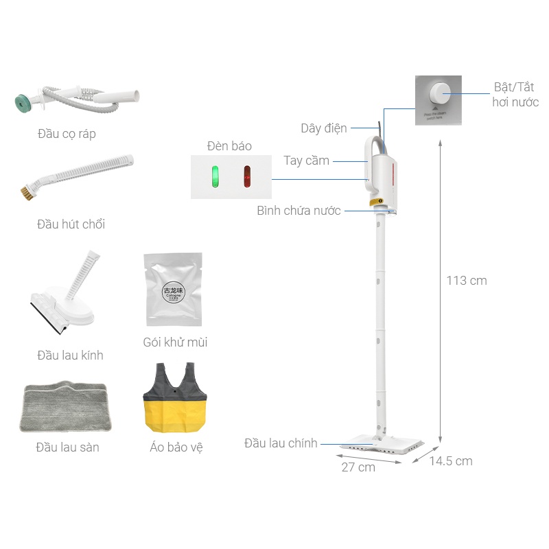 ✅ Làm sạch hơn 100 bề mặt với 4 đầu hút: đầu lau sàn, đầu hút chổi, đầu cọ ráp, đầu vệ sinh kính - là quần áo, rèm.