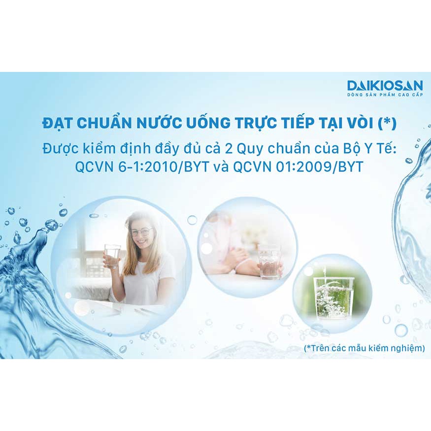 - Mẫu nước ăn uống trực tiếp sau khi qua hệ thống lọc của máy lọc nước RO nhãn hiệu Daikiosan có tác chỉ tiêu phù hợp với Quy chuẩn Việt Nam QCVN 01:2009/BYT và QCVN 6-1:2010/BYT do Bộ Y tế ban hành.