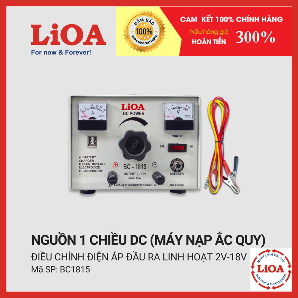 Máy nạp ắc quy LiOA BC-1815 là máy nạp sạc ắc quy do Công ty TNHH Nhật Linh sản xuất. Là dòng sản phẩm khá phổ biến, dùng cho khách hàng có nhu cầu không quá cao. Ví dụ nạp 6V, 12V với dòng nạp tối đa 15 ampe.