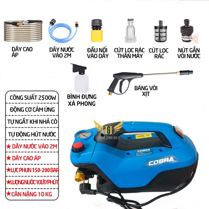 [CHÍNH HÃNG] Máy Rửa Xe Mini Gia Đình COBRA Áp Lực Cao - Công Suất Mạnh 2500W- Có Chỉnh Áp + Tặng Cần Nối Dài