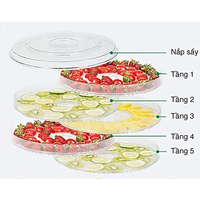 Máy có dung lượng lớn, gồm 5 tầng đáp ứng nhu cầu sấy nhiều. Giá để các khay sấy thực phẩm dùng vật liệu dày dặn, thân thiện với môi trường và chịu được nhiệt độ cao, có thể tháo lắp dễ dàng. Giá tiếp xúc trực tiếp đến thực phẩm, tránh sự xâm hại của các sinh vật từ môi trường bên ngoài.