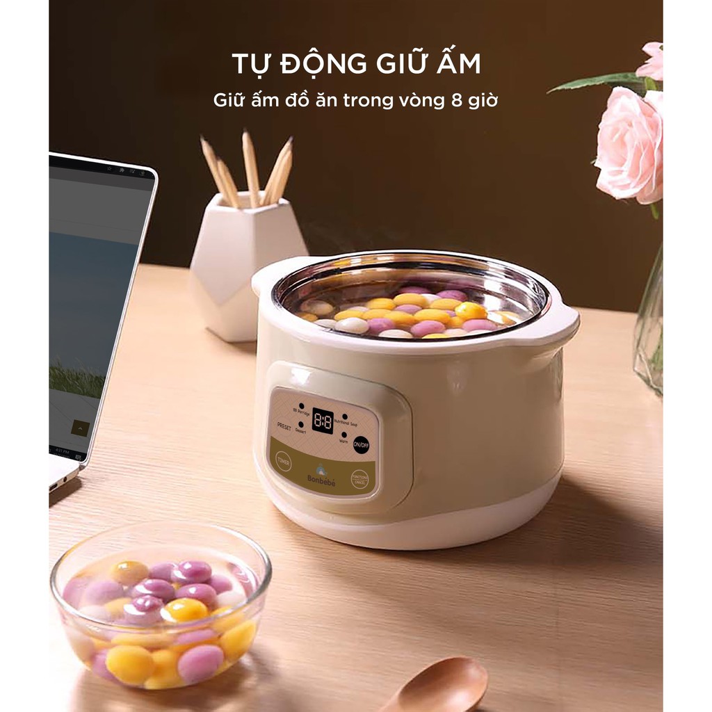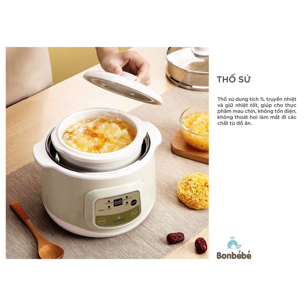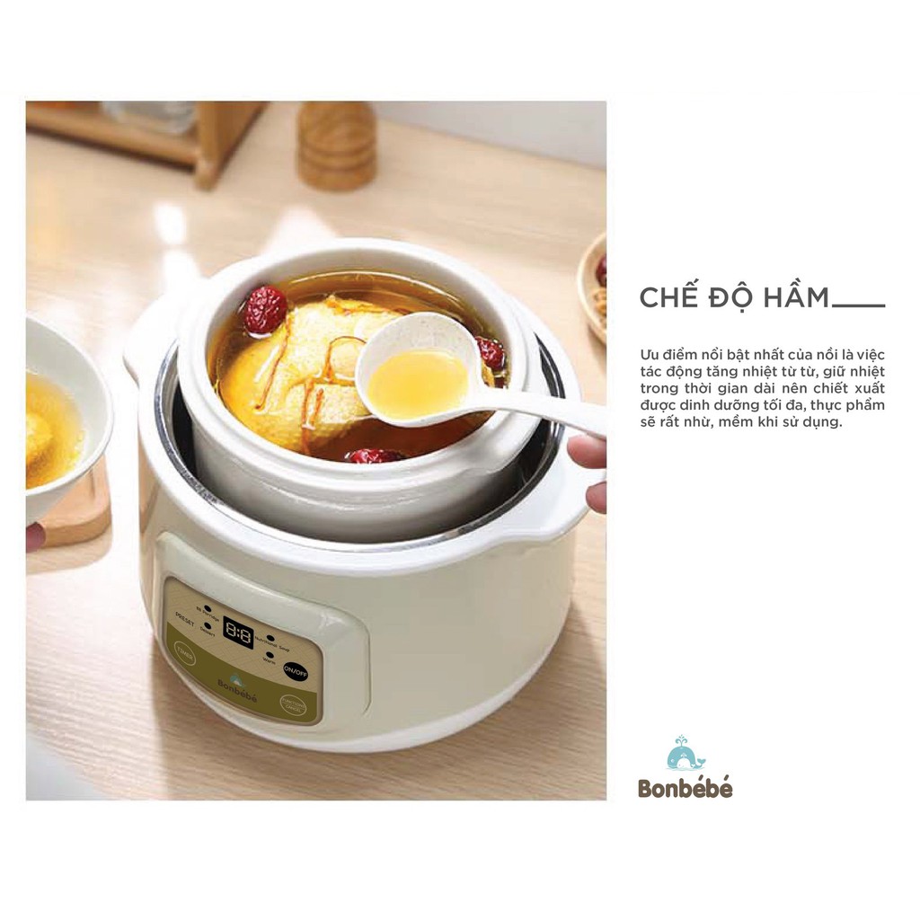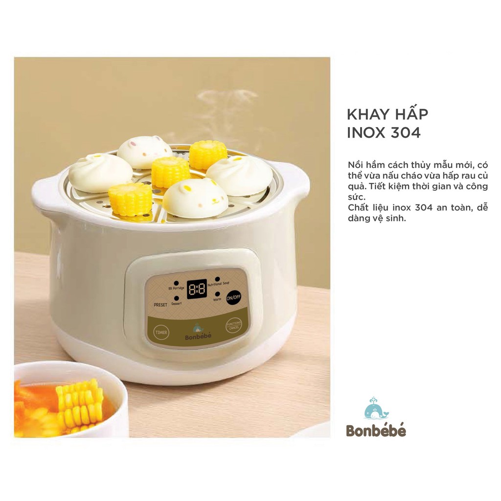 Nồi hầm cách thủy BONBÉBÉ BB-31 5IN1 đa tính năng giúp Rã đông - Hấp - Chưng - Hầm - Nấu thích hợp nấu cháo, nấu chè, chưng yến, hầm xương,... và nhiều món bổ dưỡng cùng tính năng hẹn giờ nấu tiết kiệm thời gian, tiết kiệm điện.