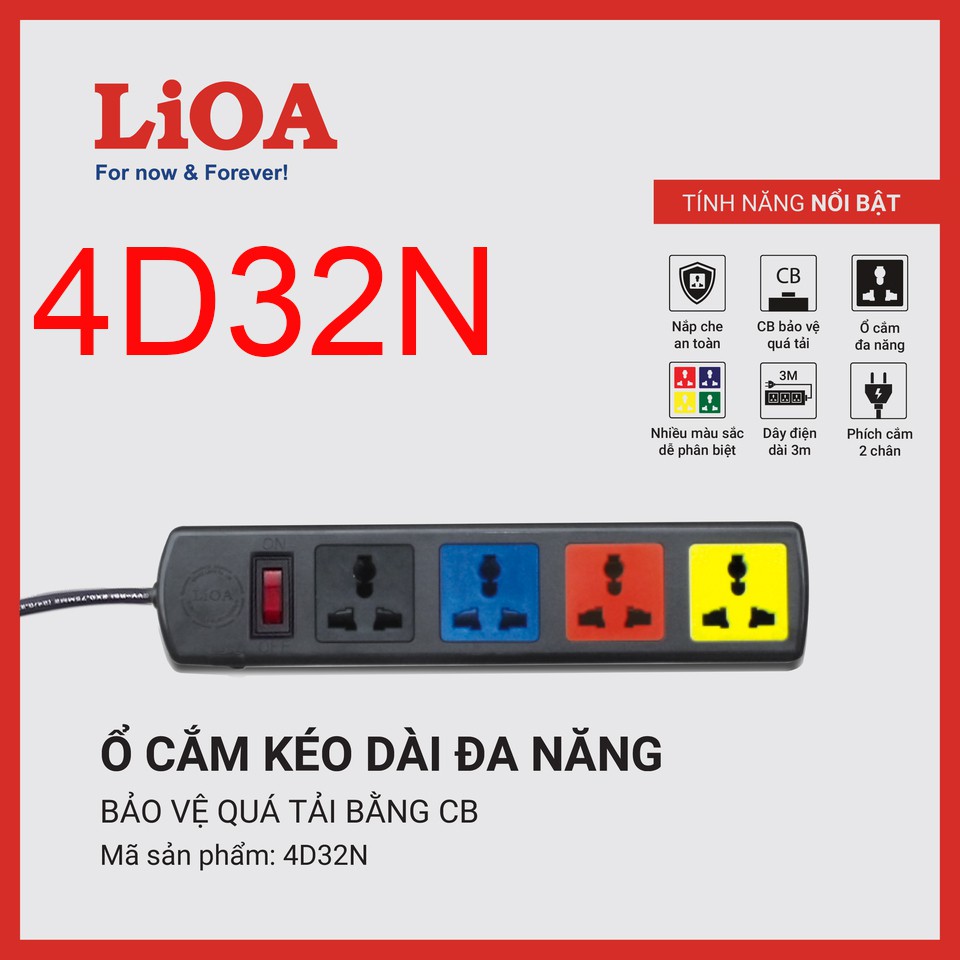[CHÍNH HÃNG] Ổ cắm LiOA 4 lỗ kéo dài đa năng 4D32N (3m) - 4D52N (5m) 4 ổ cắm 3 chấu 1 công tắc 2200W 10A