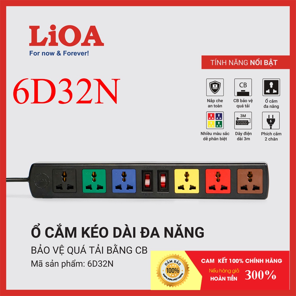 [CHÍNH HÃNG] Ổ cắm LiOA 6 lỗ kéo dài đa năng 6D32N (3m) - 6D52N (5m) - 6D33N(3m 3 lõi) - 6 ổ cắm 3 chấu 2 công tắc 2200W