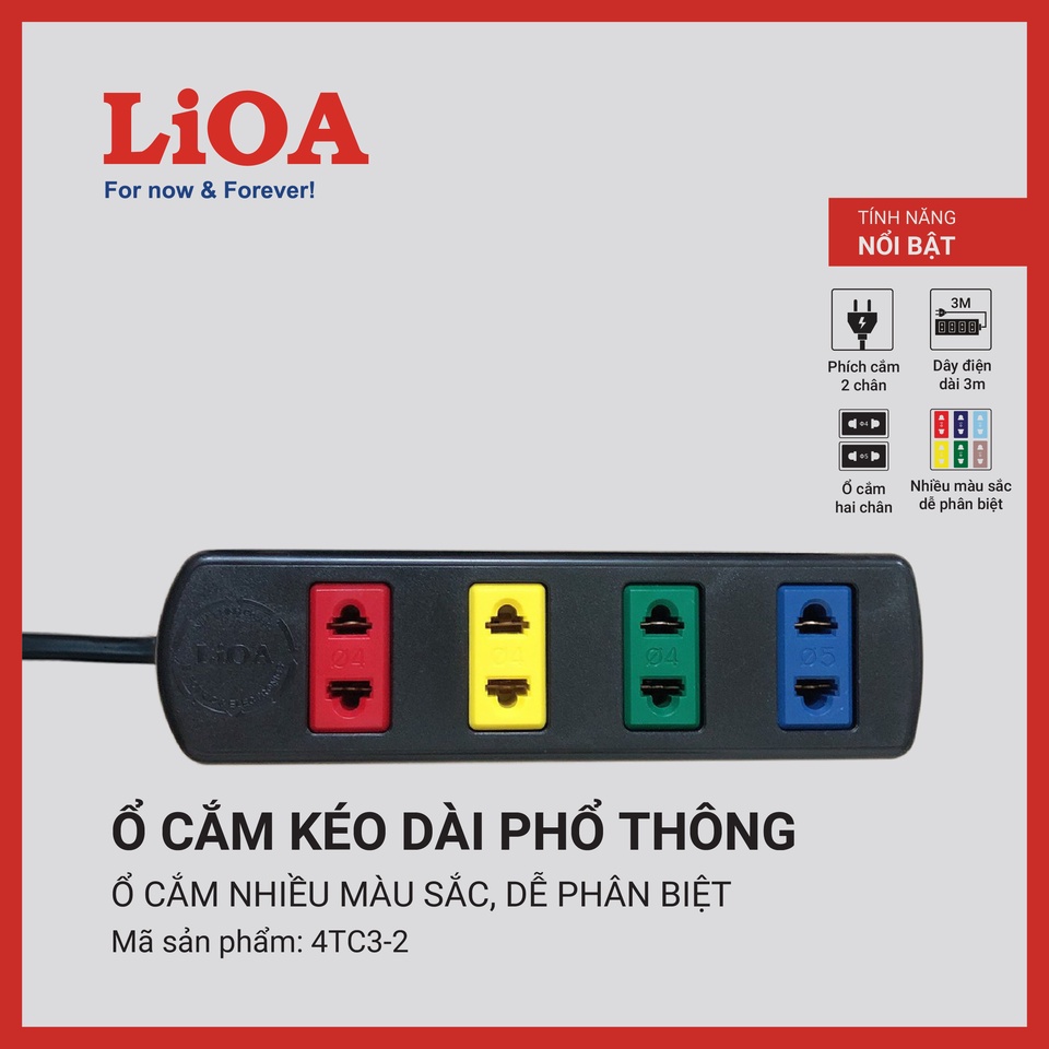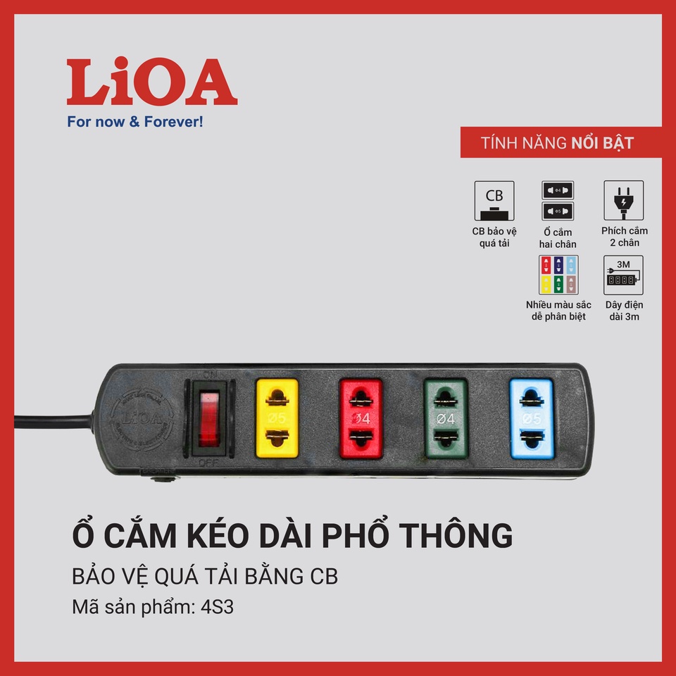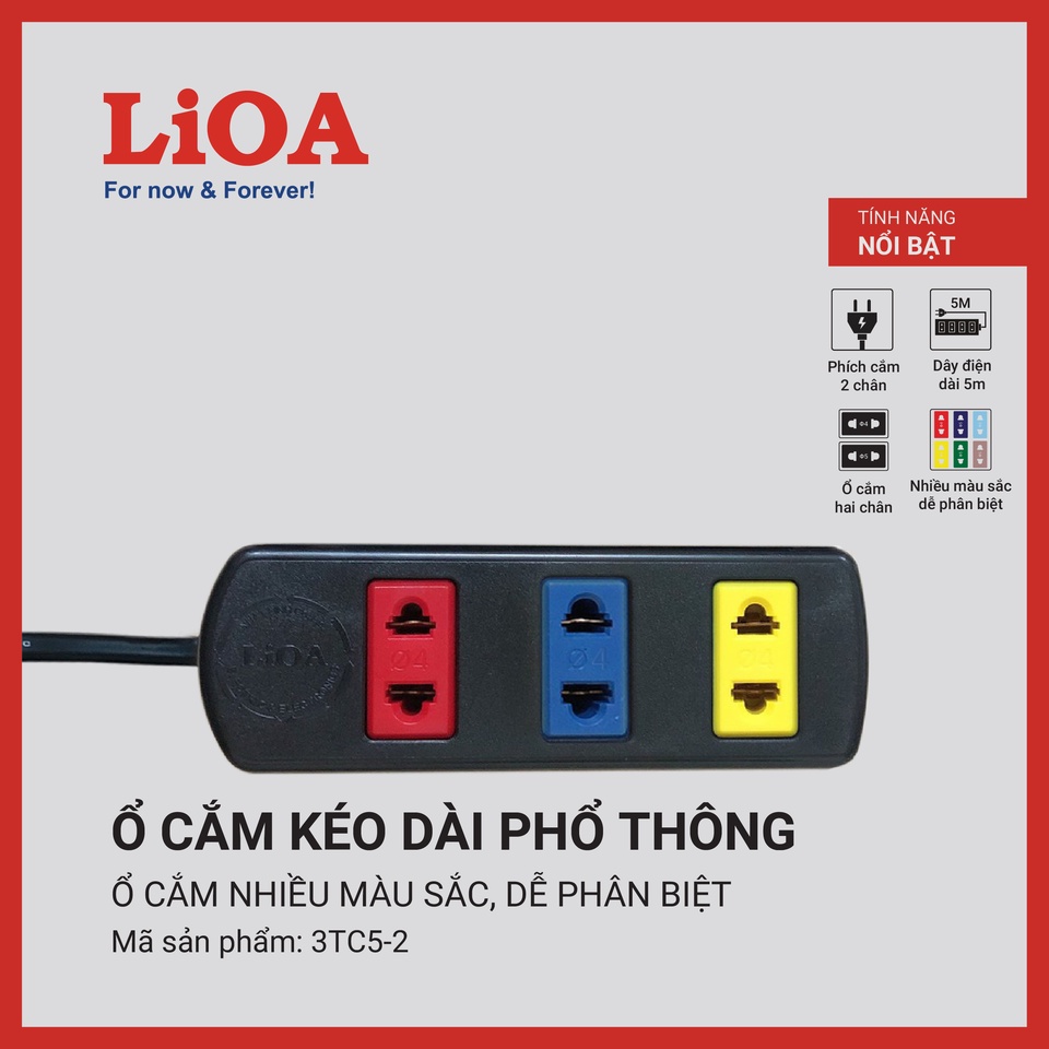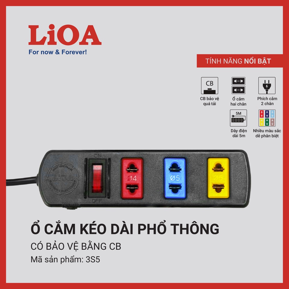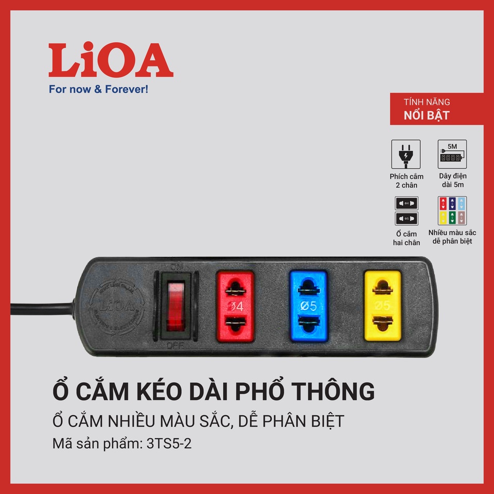 Ổ cắm kéo dài LiOA phổ thông có dây dài 3m hoặc 5m, có thể cắm nhiều các thiết bị khác nhau trên cùng một ổ cắm. Ổ cắm phổ thông LiOA kéo dài được đánh giá cao bởi có chất lượng tốt, bền bỉ, mẫu mã đẹp, giá thành rẻ... Vì vậy được người tiêu dùng tín nhiệm và sử dụng nhiều trong dân dụng và trong công nghiệp.