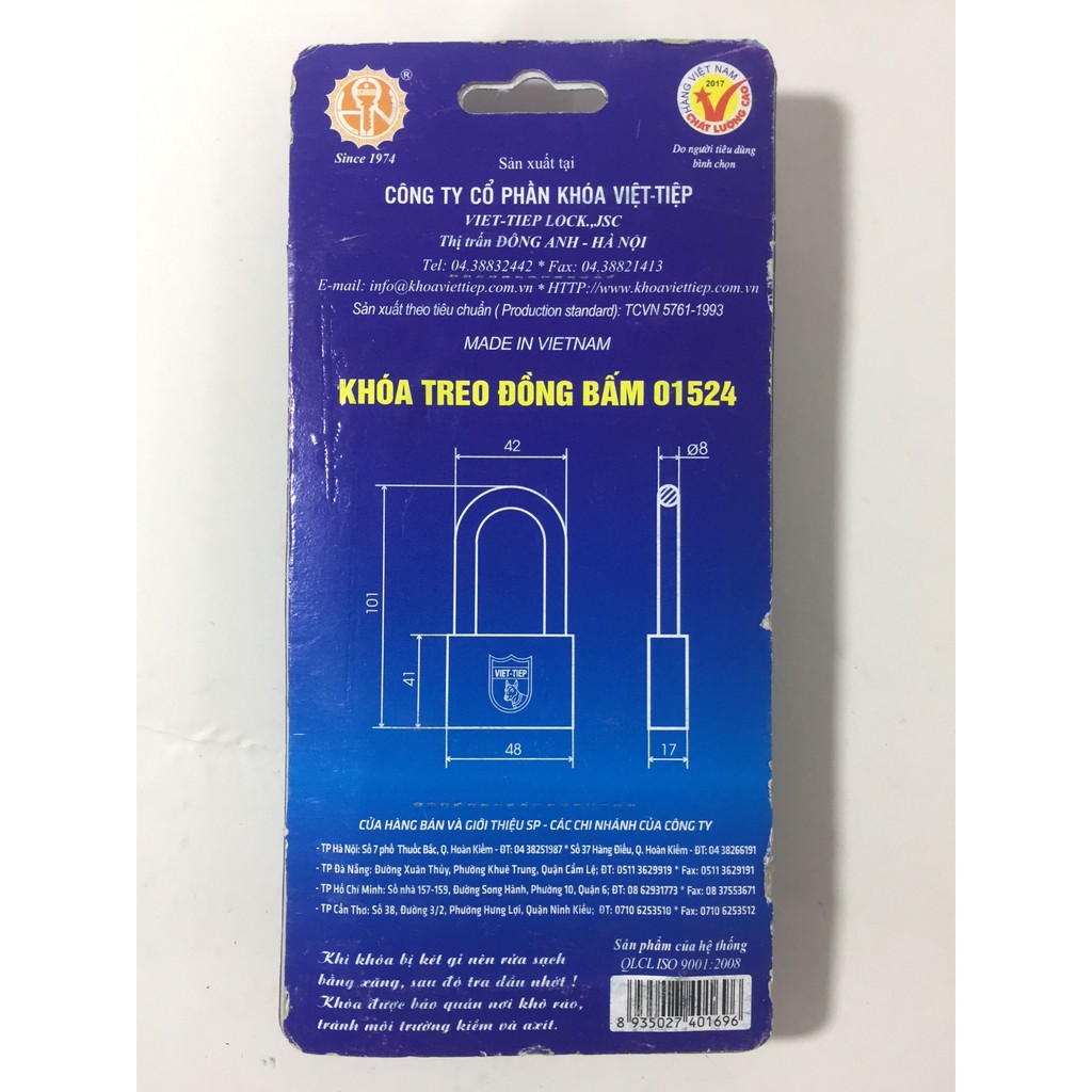 Nhà cửa & Đời sống > Bảo hộ gia đình > Khóa, ổ khóa || [CHÍNH HÃNG] Ổ Khóa Cửa VIỆT TIỆP Treo Đồng Bấm Càng Dài 5 Phân, Cao 101mm No.01524 Và 6 Phân, Cao 115mm No.01624Còn hàng
