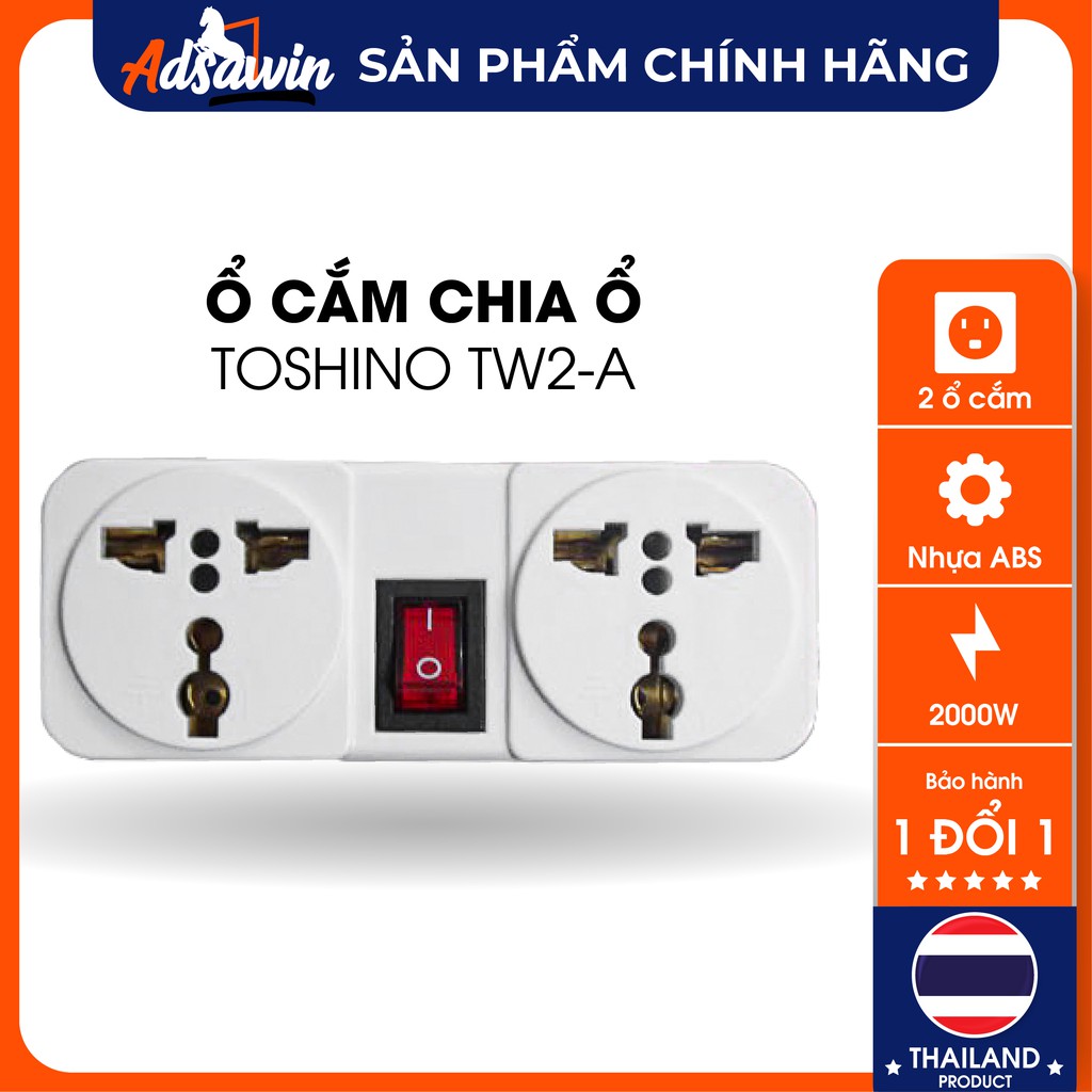 Thiết Bị Điện Gia Dụng > Mạch điện & Phụ tùng > Ổ cắm điện & Dây nối || CHÍNH HÃNG -Phích cắm (Ổ cắm) chia ổ TOSHINO TW2-A MADE IN THAILAND chia 2 ổ kèm công tắc,2000W,ABS chống cháy.Còn hàng