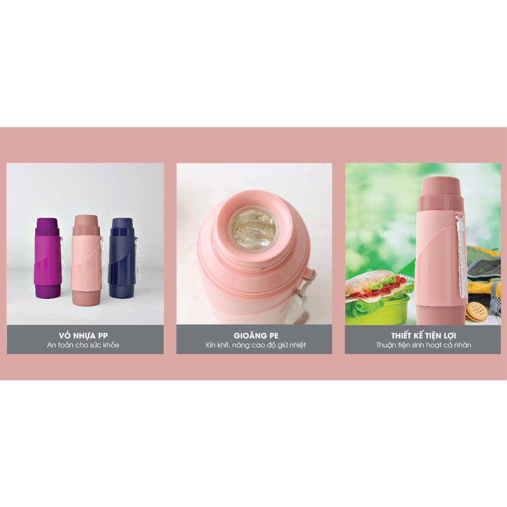 Ruột phích bằng thủy tinh cao cấp có độ bền cao, không chứa thủy ngân và hóa chất độc hại. Nắp phích chắc chắn, có độ kín khít cao. Thân và quai phích được làm bằng nhựa PP có khả năng chống va đập tốt, Gioăng PE chất lượng cao có khả năng chống lão hóa cao, rất an toàn cho người sử dụng. Với dòng sản phẩm phích giữ nhiệt mới dung tích 0.45 lít,