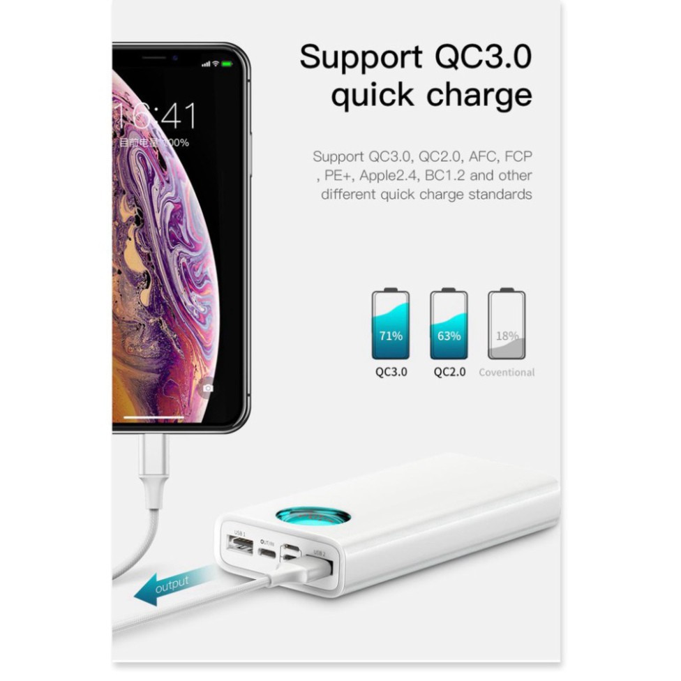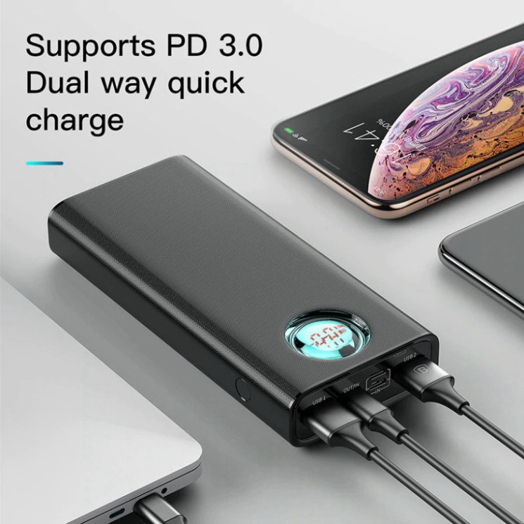 - Pin sạc dự phòng có dung lượng 20,000mAh/ 30,000mAh , hỗ trợ hầu hết các chuẩn sạc nhanh hiện nay (PPS/ PD/QC3.0...), tương thích với hầu hết các thiết bị số hiện nay từ Macbook/ Laptop cho đến Smartphone/ Tablet ... Dung lượng lớn, công suất, hiệu suất sử dụng cao (lên đến 33W bản 30,000mAh va 18W bản 20,000mAh) có 3 port (2 USB + 1 Type C) hỗ trợ sạc nhanh QC3.0 và PD3.0 , có thể dùng sạc pin cho cả 3 thiết bị cùng lúc . Giúp bạn sử dụng thoải mái hơn và quên đi nổi lo hết pin khi đi công tác, du lịch, dã ngoại ... Giúp cho mọi thiết bị của bạn luôn trong tình trạng sẳn sàng sử dụng .
