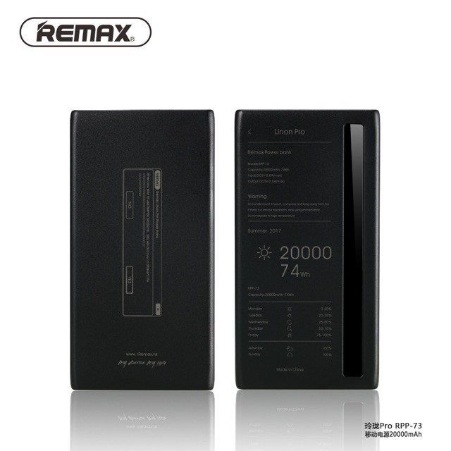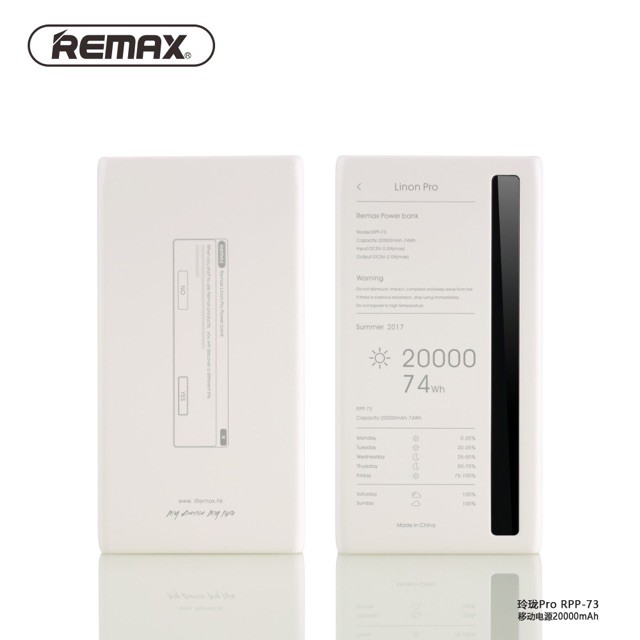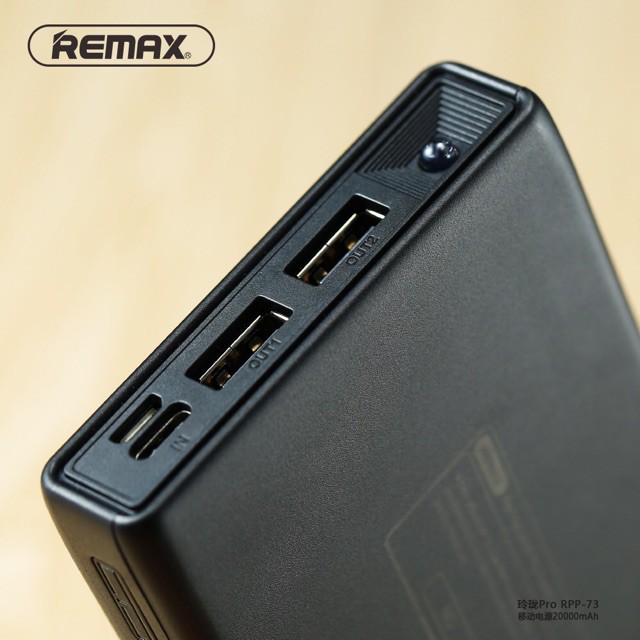 Sạc dự phòng remax rpp-73 dung lượng 20.000mAh có đèn hiển thi pin có đèn pin .Tên sản phẩm: Pin sạc dự phòng Remax RPP - 73 20.000mAh