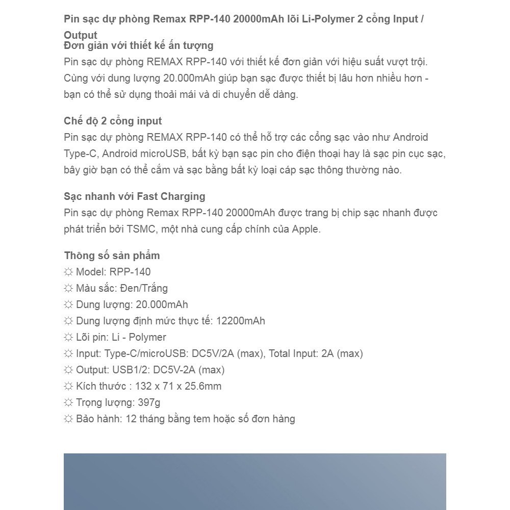 Giới thiệu [ CHÍNH HÃNG ]Pin sạc dự phòng 20000mAh REMAX sạc nhanh lõi Li-polymer 2 cổng QC3.0+1 cổng PD