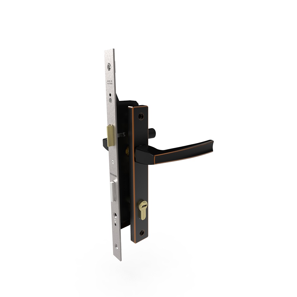 Thuộc dòng sản phẩm khóa tay nắm phổ thông dành cho cửa nhôm hệ của Khóa Huy Hoàng.Tay ốp khóa được sản xuất bằng vật liệu hợp kim kẽm, mạ đồng đen theo phong cách Mỹ.