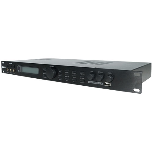 - Mặt trước bao gồm các màn hình LCD, chỉnh bằng tay các nút music, mic, effect, nút tổng control, cổng kết nối USB, 3 cổng micro 6 ly...