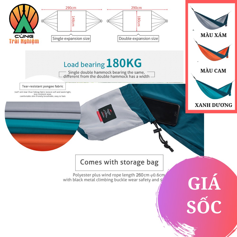 - Với diện tích có thể sử dụng siêu lớn, vật liệu siêu nhẹ, nằm gọn trong lòng bàn tay bạn mỗi khi gấp lại, bạn có thể mang theo võng đôi NatureHike tới bất kì đâu và sử dụng trên mọi địa hình, chỉ cần có cây cối xung quanh.