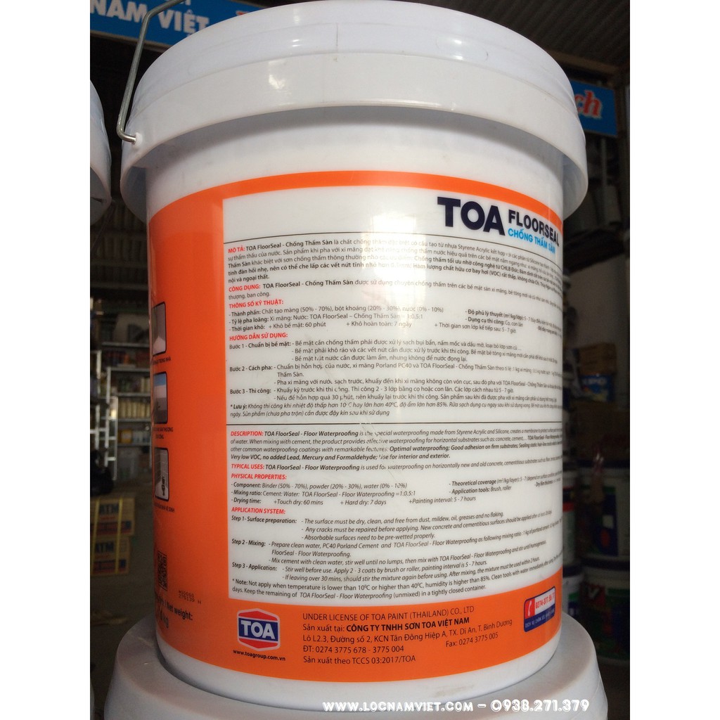 Chống thấm sàn TOA FloorSeal - là chất chống thấm đặc biệt có cấu tạo từ nhựa Styrene Acrylic và các phân tử Silicone, tạo thành lớp màng bảo vệ bề mặt khỏi sự thẩm thấu của nước.Sản phẩm khi pha với xi măng đạt khả năng chống thấm nước tối ưu trên các bề mặt nằm ngang như: xi măng, hồ vữa, bê tông...TOA FloorSeal - Chống Thấm Sàn được sử dụng chuyên chống thấm trên các bề mặt sàn xi măng, bê tông mới và cũ như: Sàn nhà, Tầng hầm, Sàn nhà vệ sinh, Sân thượng, Ban công