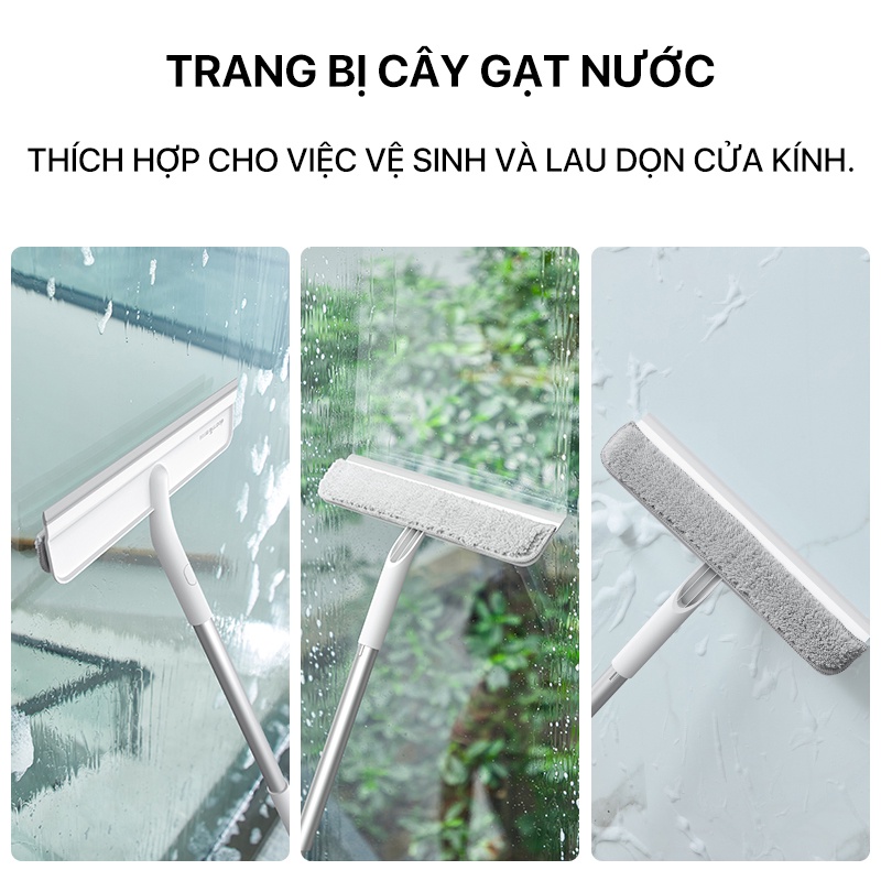Bộ sản phẩm còn kèm cây gạt nước đa năng với thiết kế khăn lau vải sợi mềm mỏng, thích hợp cho việc vệ sinh và lau dọn cửa kính. Bên cạnh đó, dụng cụ này cũng có thể được dùng để lau chùi gương nhà tắm, bề mặt tường và sàn nhà sau khi tắm. Dễ dàng điều chỉnh độ dài của tay cầm một cách linh hoạt cho từn