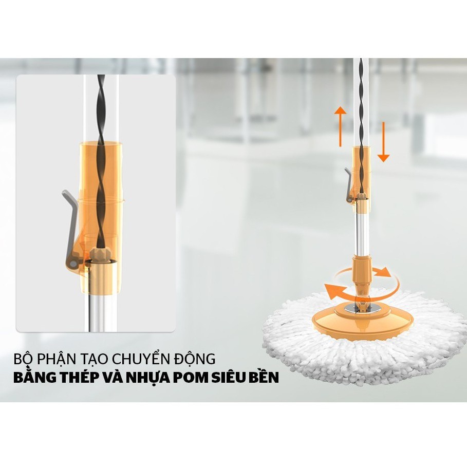 Cây lau nhà 360 độ - bộ lau nhà thông minh kèm thùng tự vắt - chổi lau nhà tự vắt thông minhCây lau nhà 360 độ 1 thùng chứa nước, 2 bông lau cùng 1 cây lau Thùng chứa được làm bằng chất liệu nhựa cao cấp, chất lượng Phần bông lau được làm bằng sợi bông đan chéo siêu mịn Loại: Bộ lau nhà đa năng xoay tay thông minh Chất liệu thùng: Nhựa PE, PP, APS bền và khó vỡ Chất liệu: thân cây, lồng Xi inox cao cấp chống gỉ bền với thời gian Sợi vải bông lau: Sợi Ru Microfiber thấm hút tốt, khô nhanh hơn, sạch bụi bẩn Tính năng: Miễn đạp – miễn vắt – miễn cắm điện – miễn chờ đợi – không quỳ gối