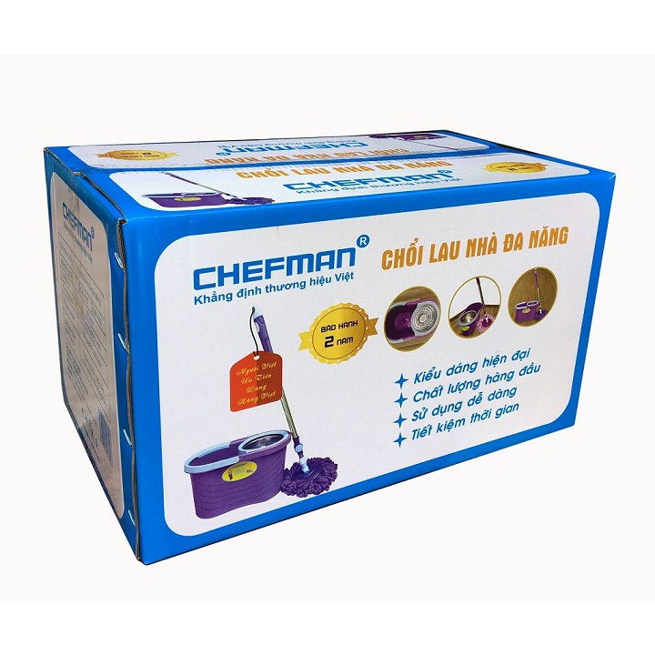 - Chổi lau nhà Chefman CM - 416 được thiết kế 3 bộ phận cơ bản gồm 1 thùng chứa nước, 1 thân cây lau nhà bàn Inox và 2 bông lau.