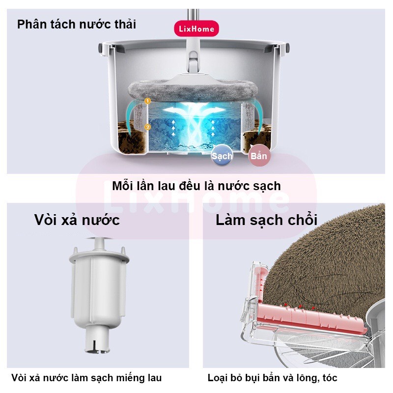 - Chổi lau nhà siêu sạch nhờ Bông lau sợi Microfiber tiên tiến giúp lấy hết rác, tóc và giảm tĩnh điện cho mặt sàn. Thùng lau nhà thông mình có lỗ thoát nước tiện lợi để xả nước giặt sau khi sử dụng
