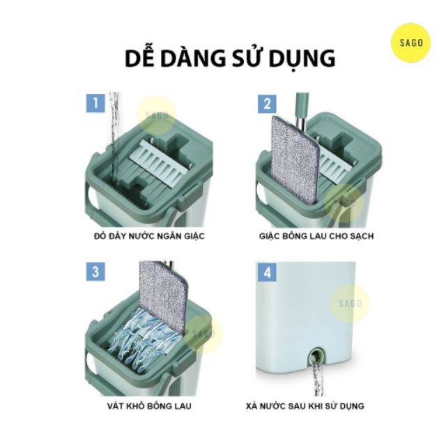 - Trong quá trình lau dọn, thao tác kéo và đẩy rất nhẹ nhàng cũng như việc giặc và vắt khô bông lau thì một xô nước là đủ để giải quyết toàn bộ phòng ngủ, hoặc phòng khách của bạn.