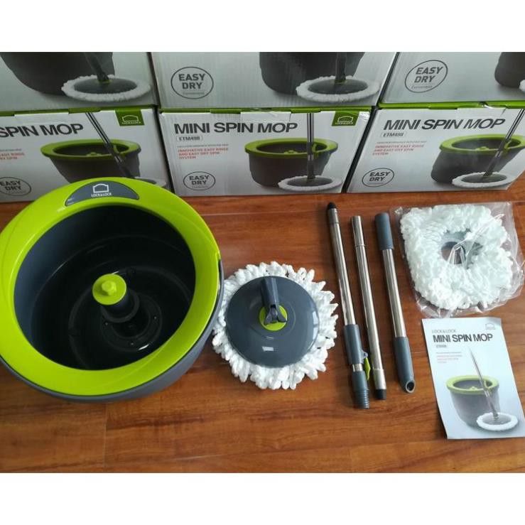 - Cây lau nhà xoay tay mini Spin Mop Lock and Lock ETM498 gồm 1 thùng chứa nước, 2 bông lau cùng 1 cây lau, sẽ góp phần giúp bạn giữ cho nhà cửa luôn được sạch sẽ và khô thoáng.