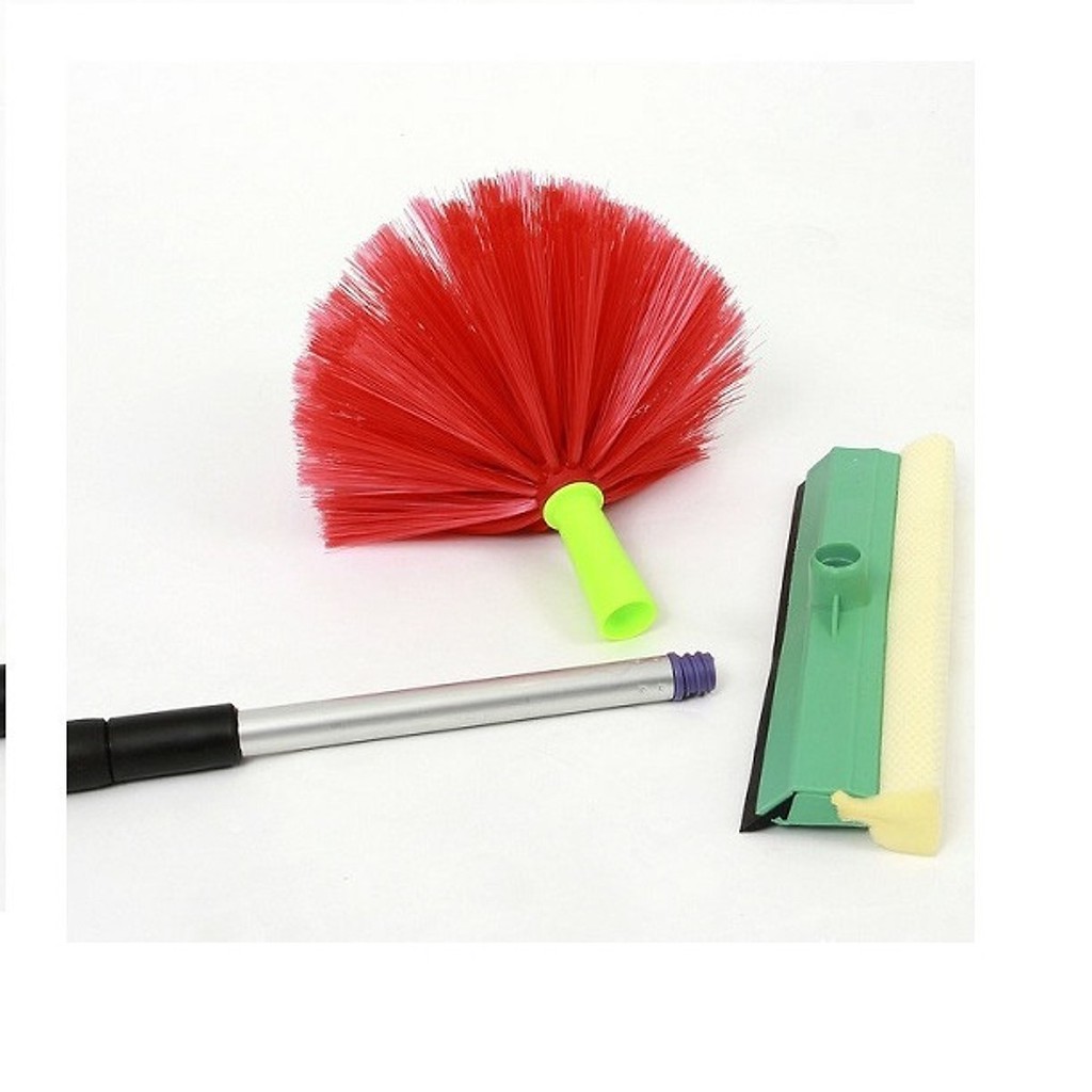 - Đầu chổi gồm 3 dụng cụ: Đầu chổi quét mạng nhện: làm bằng nhựa tổng hợp ( có thể vệ sinh sạch sẽ bằng nước sau mỗi lần sử dụng) Đầu chổi lau kính, gương, trần nhựa: 2 mặt bằng cao su và mút lưới Đầu 2 chạc: Dùng để phơi quần áo, treo móc đồ vật trên cao.