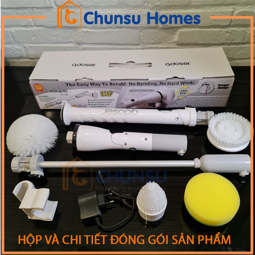 ✔️ Đóng gói sản phẩm bao gồm: Chổi vệ sinh Jesopb K-129, 4 đầu chà cọ, Cục Xạc Pin, móc treo và hướng dẫn sử dụng.