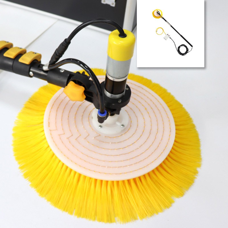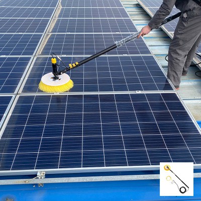 Để nhanh và tiện lợi cần có những thiết bị chuyên dụng. Dưới đây là mẫu thiết bị vệ sinh tấm pin năng lượng mặt trời có động cơ moto ở đầu bàn chải và có vòi gắn nước.