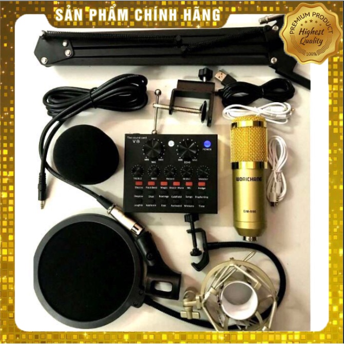 Combo mic thu âm bm-900 sound card V8 - 5 món bao gồm 5 món: Micro thu âm Ami BM900, sound card hát karaoke V8, màng lọc, giá đỡ micro, dây để livestream (trọn bộ không cần thêm bắt kỳ thiết bị nào khác)Bộ sản phẩm đầy đủ cho bạn thỏa sức thu âm những bài hát yêu thích.