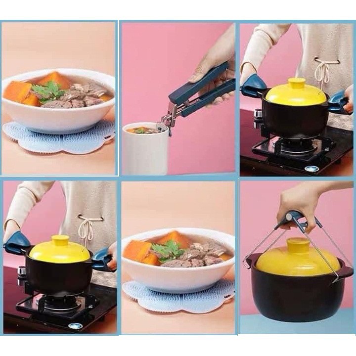 ĐẶC ĐIỂM NỔI BẬT:– Bộ sản phẩm bao gồm 6 chi tiết: 1 kẹp gắp đĩa, 1 kẹp nhấc bát, 2 lót tay hình mỏ vịt và 2 miếng lót nồi
