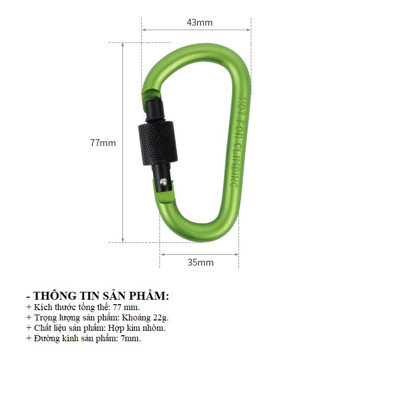 Móc khóa Carabiner được làm bằng hợp kim nhôm có độ bền cao, chống mài mòn, không thấm nước, có chốt khóa chắc chắn, màu sắc đa dạng.- Thông số sản phẩm:
