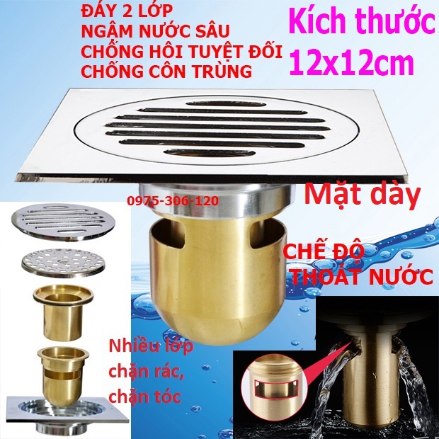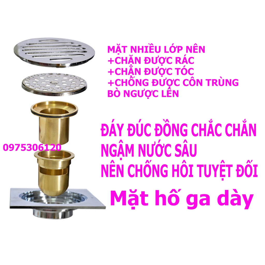 Giới thiệu [CHỐNG HÔI TUYỆT ĐỐI] Phễu thoát sàn Hố Ga Lược rác chống mùi hôi phần đáy đồng dài khít nên chống hôi tốt HG1 12x12cm