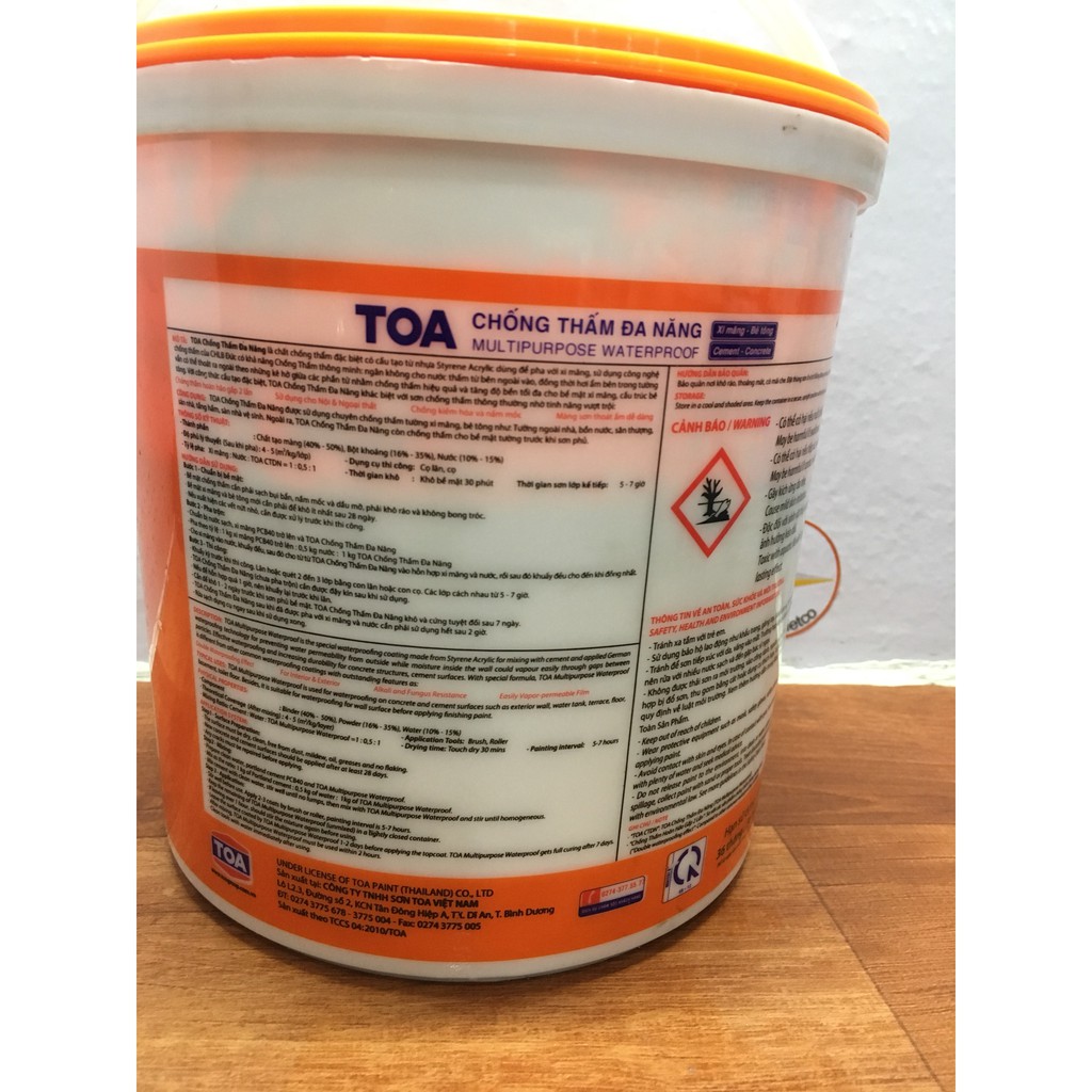 TOA Chống Thấm Đa Năng là chất chống thấm đặc biệt có cấu tạo từ nhựa Styrene Acrylic dùng để pha với xi măng, sử dụng công nghệ chống thấm của CHLB Đức có khả năng Chống Thấm thông minh: ngăn không cho nước thấm từ bên ngoài vào, đồng thời hơi ẩm bên trong tường vẫn có thể thoát ra ngoài theo những kẽ hở giữa các phần tử nhằm chống thấm hiệu quả và tăng độ bền tối đa cho bề mặt xi măng, cấu trúc bê tông.TOA Chống Thấm Đa Năng khác biệt với sơn chống thấm thông thường nhờ tính năng vượt trội:
