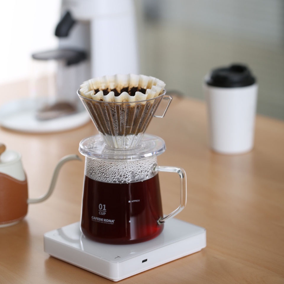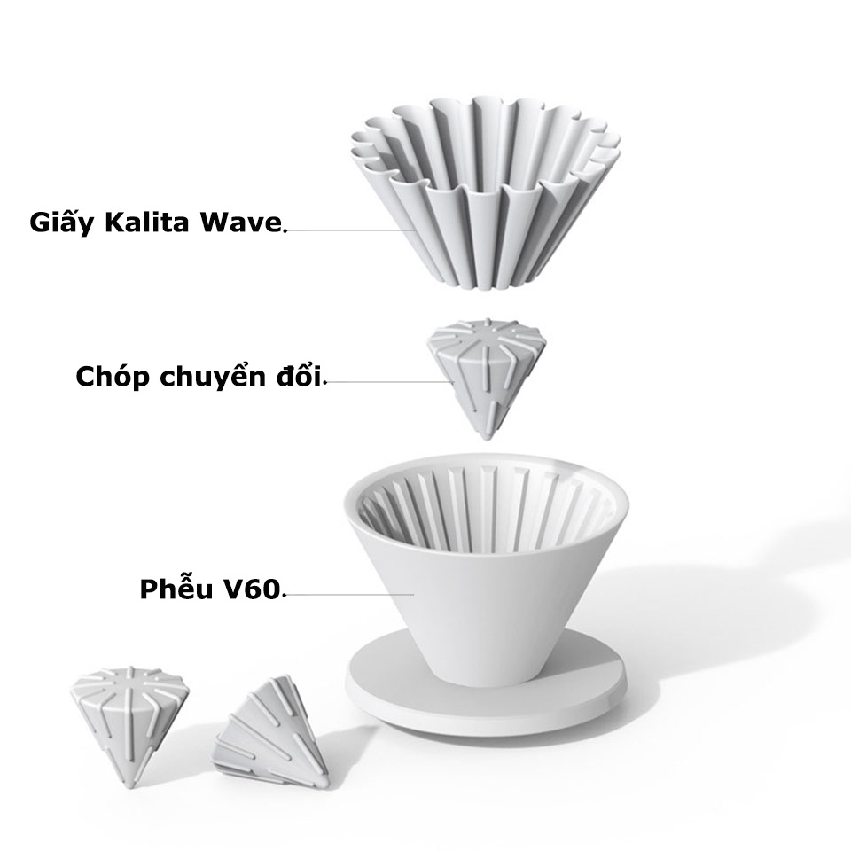 Đặt chóp nón chuyển đổi trong lòng đáy của bất kỳ loại phễu V60 nào là có thể sử dụng giấy Kalita Wave vừa vặn lên trên và bắt đầu quá trình pha chế cà phê.