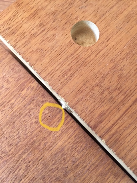 Gắn chốt định vị vào lỗ đã khoan sẵn ở tấm ván A.