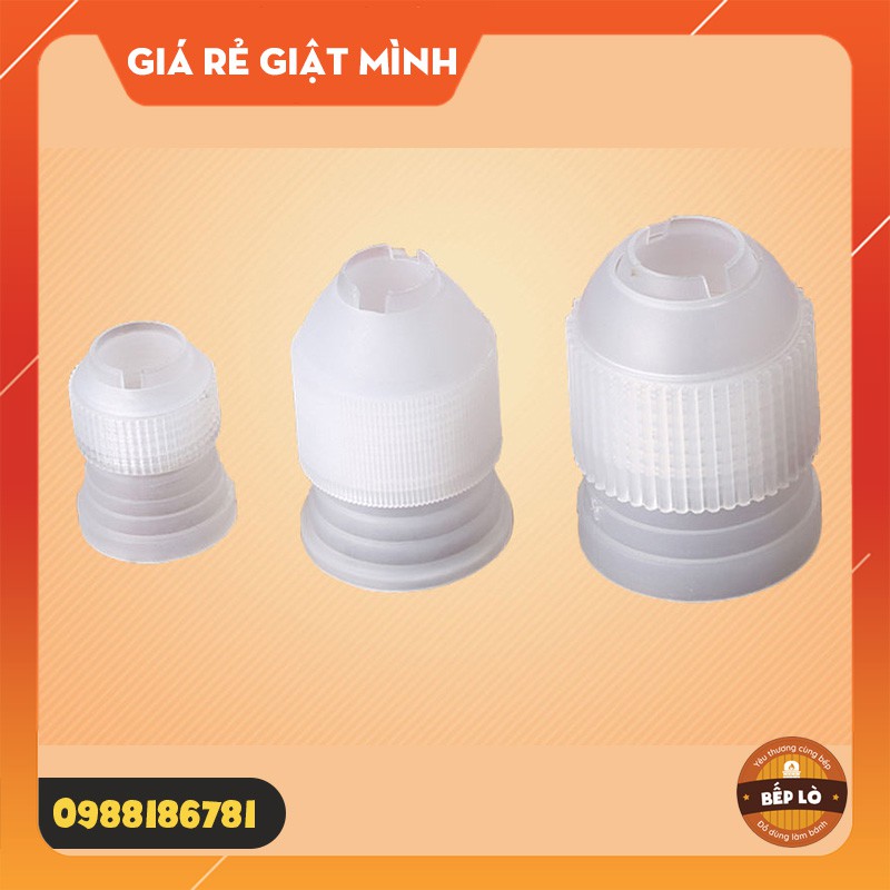 Chốt giữ đui/khớp nối đui bắt bông kem trang trí bánh sinh nhật.Chốt/ khớp nối đui làm bằng nhựa gồm hai phần giúp cho bạn có thể thay đổi đui bắt kem mà không cần phải đổi luôn cả túi. Một miếng nhựa được nhét vào trong túi và một vòng nhựa – dùng để giữ đầu túi – có thể vặn từ bên ngoài. Nếu bạn định sử dụng nhiều loại đui khác nhau để tạo nhiều kiểu dáng với cùng một loại kem phủ hãy sử dụng chốt giữ đui. Công việc sẽ dễ dàng hơn rất nhiều.