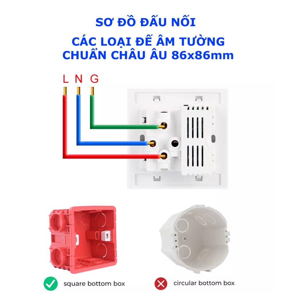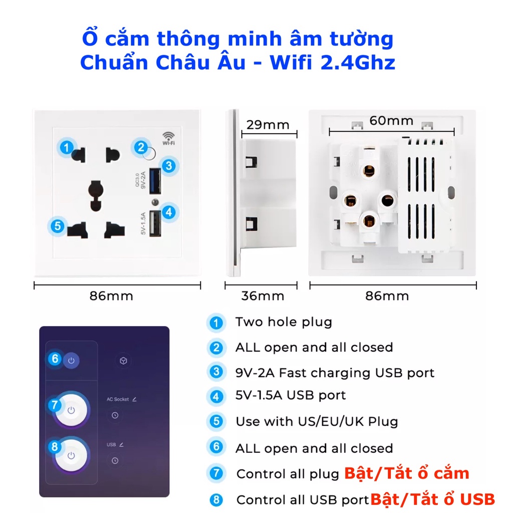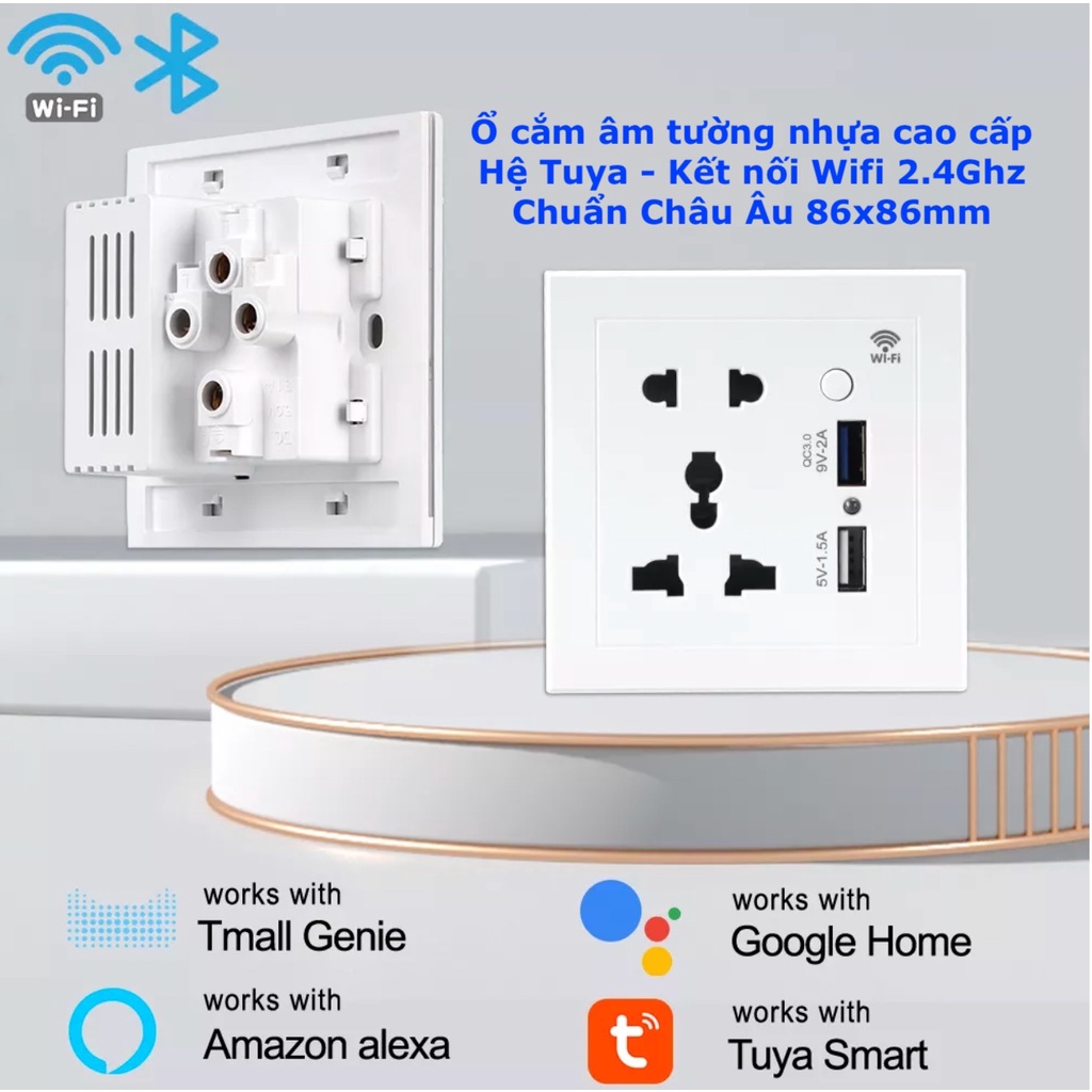 Chuẩn Châu Âu 86x86 mm, ổ cắm âm tường thông minh, kết nối Wifi, hệ Tuya / Smart Life -