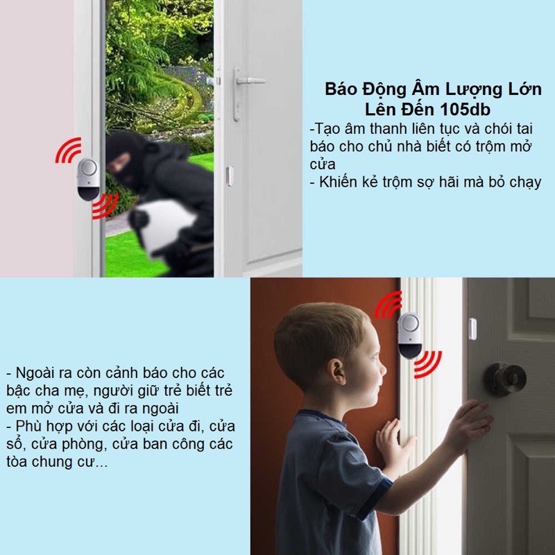 - Khi có người mở cửa và xâm nhập từ bên ngoài, máy sẽ phát ra âm thanh báo hiệu> 90dB, giúp người trong nhà nhận biết được nguy hiểm. Đây là sản phẩm tiện ích mà muốn giới thiệu đến các bạn. Đặc biệt vào buổi tối chỉ với thiết bị nhỏ gọn bạn có thể phát hiện ngay cửa nhà mình bị mở ra.
