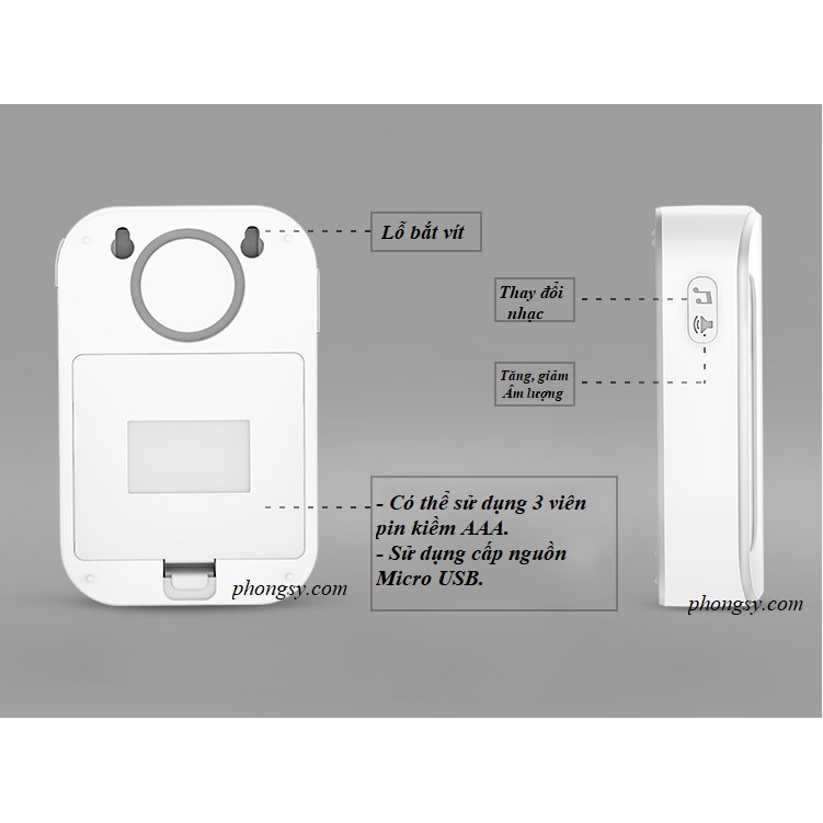 - Chuông báo không dây: dùng 3 pin tiểu AA hoặc nguồn 5V Micro USB