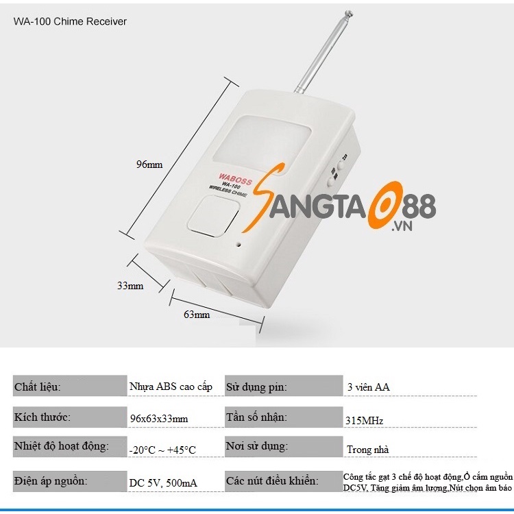 Chuông báo khách không dây cảm biến hồng ngoại WABOSS là một phiên bản cao cấp khoảng cách thu nhận tín hiệu giữa bộ thu và bộ phát tín hiệu lên tới 20 mét xuyên qua 3-5 bức tường. Vì vậy bạn hoàn toàn có thể đặt bộ thu tín hiệu trong phòng hoặc trên tầng 2. Đây là bộ chuông báo khách không dây có khả năng thu nhận tín hiệu xa nhất trên thị trường hiện nay.THÔNG SỐ KÝ THUẬT: ( ẢNH )