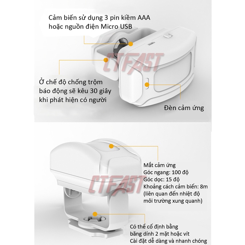 Chuông báo khách cửa hàng CTFAST-02, báo động chống trộm, cảm biến chuyển động hồng ngoạiLà một thiết bị chuông báo cảm biến thông minh được sử dụng nhiều trong gia đình, các cửa hàng, văn phòng, nhà hàng. Thiết bị sẽ tự phát ra lời chào khách khi có khách ghé thăm cửa hàng khi được tích hợp lời chào của 6 ngôn ngữ khác nhau với 46 nhạc chuông báo khách. Âm cảnh báo lớn phát hiện và báo động khi có trộm xâm nhập.