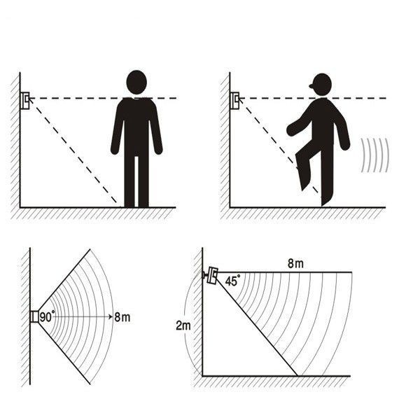 – Độ cao lắp đặt 2 mét, tầm quét xa của cảm biến là 4-6 mét, góc quét 90 độ